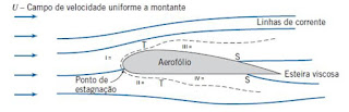 I - O escoamento da corrente livre com velocidade U se choca com a parte frontal do aerofólio e se divide no ponto de estagnação (ponto em que a velocidade é máxima).