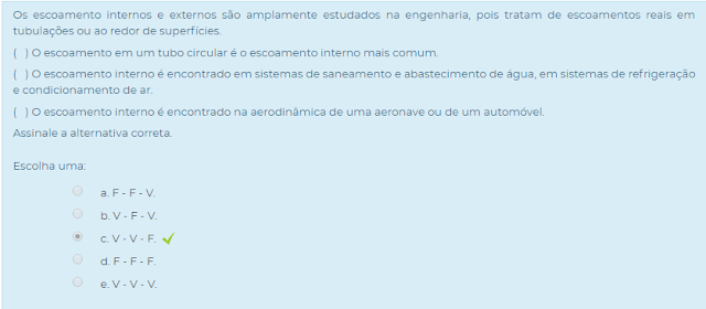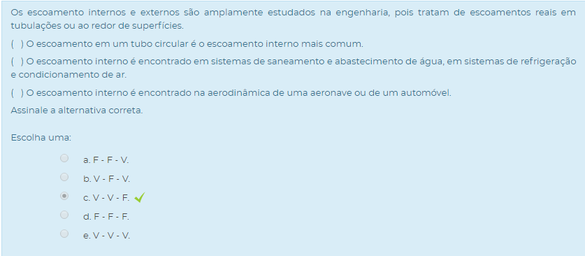( ) O escoamento interno é encontrado em sistemas de saneamento e abastecimento de água, em sistemas de refrigeração e condicionamento de ar.