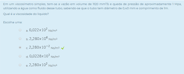 1) Em um viscosímetro simples, tem-se a vazão em volume de 1120 mm³/s e queda de pressão de aproximadamente 1 Mpa, utilizando a água como fluido desse tubo, sabendo-se que o tubo tem diâmetro de 0,40 mm e comprimento de 1m.