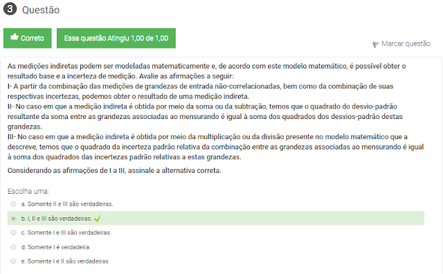 3 As medições indiretas podem ser modeladas matematicamente e, de acordo com este modelo matemático, é possível obter o resultado base e a incerteza de medição. Avalie as afirmações a seguir: