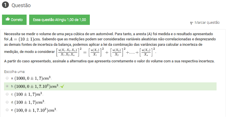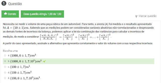 1 Necessita-se medir o volume de uma peça cúbica de um automóvel. Para tanto, a aresta (A) foi medida e o resultado apresentado foi A=(10+OU-1)cm . Sabendo que as medições podem ser consideradas variáveis aleatórias não-correlacionadas e desprezando as demais fontes de incerteza da balança, podemos aplicar a lei da combinação das variâncias para calcular a incerteza de medição, de modo a considerar