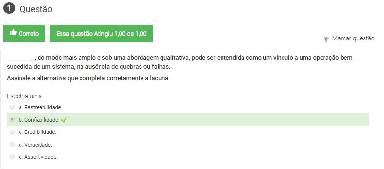 1 __________, do modo mais amplo e sob uma abordagem qualitativa, pode ser entendida como um vínculo a uma operação bem sucedida de um sistema, na ausência de quebras ou falhas.