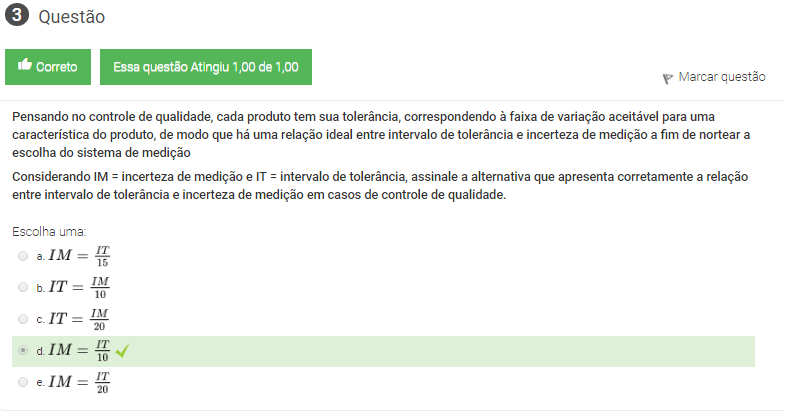 Considerando IM = incerteza de medição e IT = intervalo de tolerância, assinale a alternativa que apresenta corretamente a relação entre intervalo de tolerância e incerteza de medição em casos de controle de qualidade.