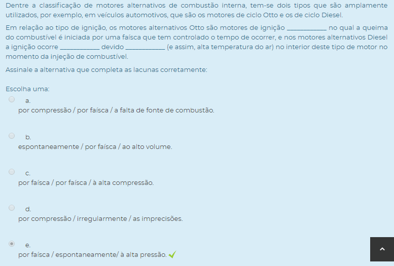 Em relação ao tipo de ignição, os motores alternativos Otto são motores de ignição ____________ no qual a queima do combustível é iniciada por uma faísca que tem controlado o tempo de ocorrer, e nos motores alternativos Diesel a ignição ocorre ____________ devido ____________ (e assim, alta temperatura do ar) no interior deste tipo de motor no momento da injeção de combustível.