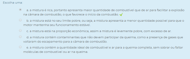 1) Na análise de uma determinada mistura ar-combustível, verifica-se a Fração relativa combustível-ar, que é a razão da fração real de ar-combustível pela fração estequiométrica para um determinado combustível e, a partir do resultado, é possível determinar se a mistura é rica, pobre ou estequiométrica.