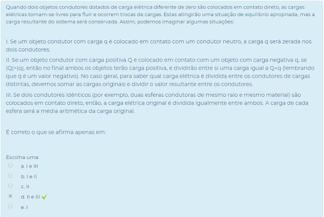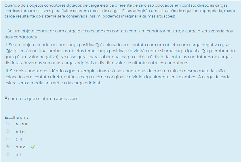 II. Se um objeto condutor com carga positiva Q é colocado em contato com um objeto com carga negativa q, se |Q|>|q|, então no final ambos os objetos terão carga positiva, e dividirão entre si uma carga igual a Q+q (lembrando que q é um valor negativo). No caso geral, para saber qual carga elétrica é dividida entre os condutores de cargas distintas, devemos somar as cargas originais e dividir o valor resultante entre os condutores.