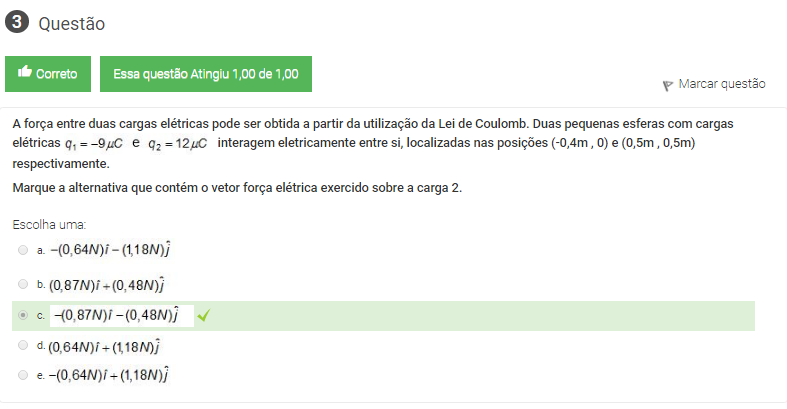 2 Uma carga q3=2.10^-5C localizada no ponto (0,0) de um sistema de coordenadas encontra-se sob a influência de duas cargas q1=-3.10^-5 C e q2=4.10^-5C localizadas respectivamente nos pontos (0,5 ; 1,2) e (0 ; -0,6) em unidades do SI. A lei de Coulomb permite o cálculo da força à qual a carga 3 encontra-se submetida.