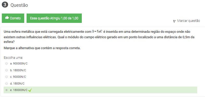 3 Uma esfera metálica que está carregada eletricamente com Q=5uc é inserida em uma determinada região do espaço onde não existem outras influências elétricas. Qual o módulo do campo elétrico gerado em um ponto localizado a uma distância de 0,5m da esfera?