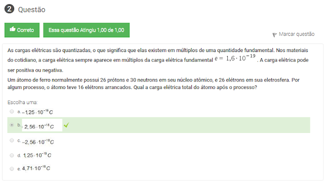 Um átomo de ferro normalmente possui 26 prótons e 30 neutrons em seu núcleo atômico, e 26 elétrons em sua eletrosfera. Por algum processo, o átomo teve 16 elétrons arrancados. Qual a carga elétrica total do átomo após o processo?