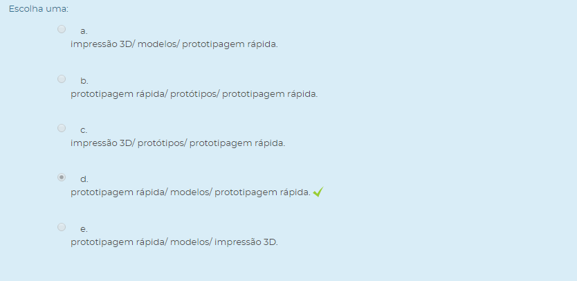 | 4 - Prototipagem | IV - É um modelo original no qual algo é padronizado, pode ser definido como a primeira forma em escala natural e funcional. |