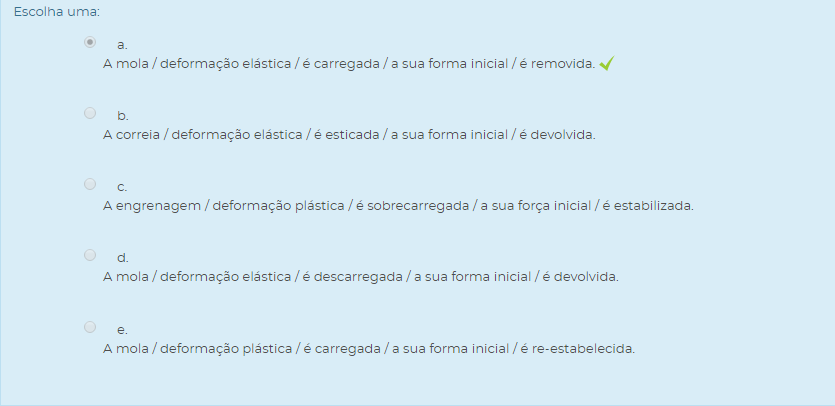 __________ pode ser definida como um elemento de máquina que apresenta __________ quando __________, e que depois recupera ___________ quando a carga ___________.
