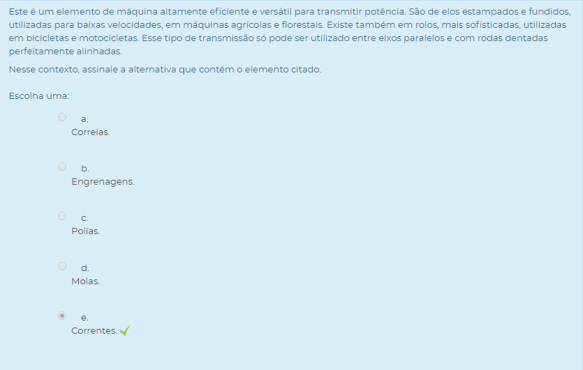 1) A corrente é um elemento de máquina altamente eficiente e versátil para transmitir potência. São de elos estampados e fundidos, utilizadas para baixas velocidades, em máquinas agrícolas e florestais. Existe também em rolos, mais sofisticadas, utilizadas em bicicletas e motocicletas. Esse tipo de transmissão só pode ser utilizado entre eixos paralelos e com rodas dentadas perfeitamente alinhadas.