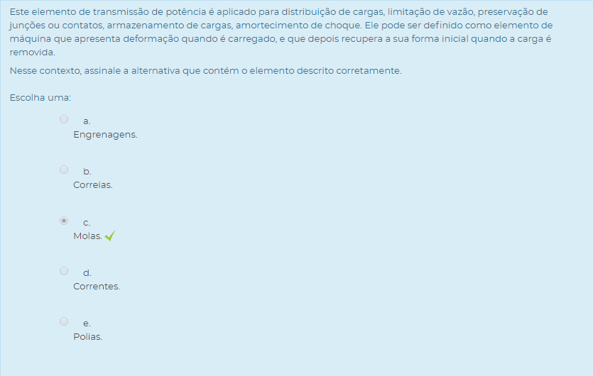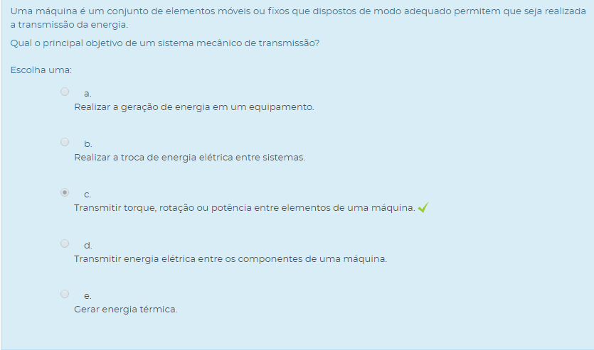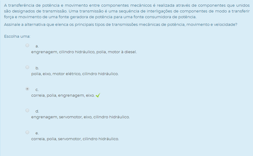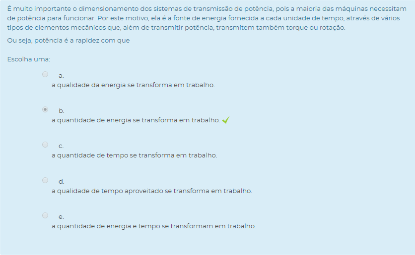 1) É muito importante o dimensionamento dos sistemas de transmissão de potência, pois a maioria das máquinas necessitam de potência para funcionar. Por este motivo, ela é a fonte de energia fornecida a cada unidade de tempo, através de vários tipos de elementos mecânicos que, além de transmitir potência, transmitem também torque ou rotação.