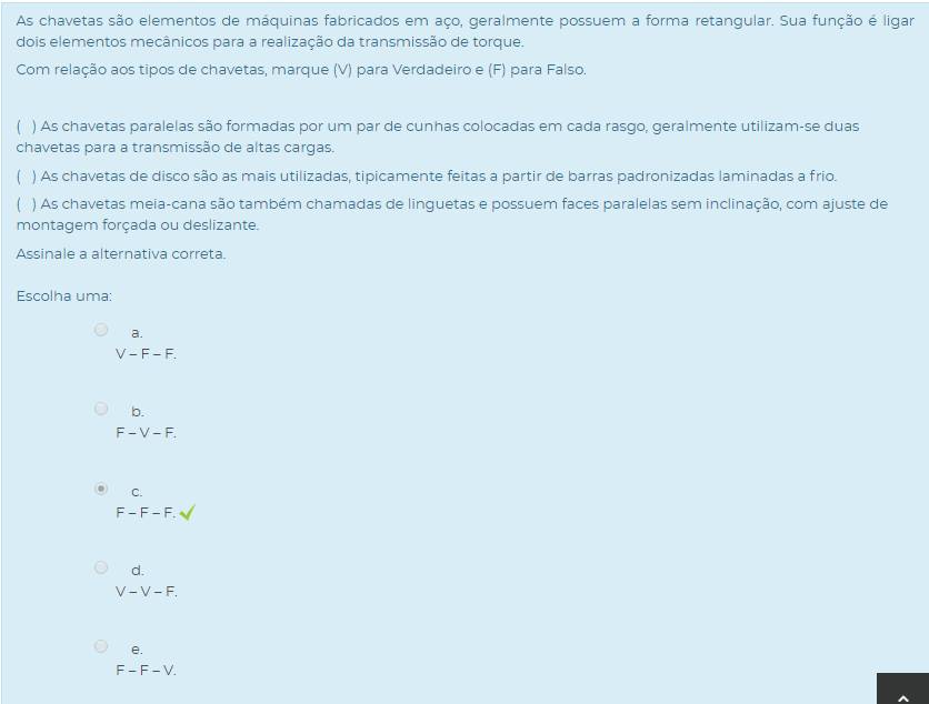 Com relação aos tipos de chavetas, marque (V) para Verdadeiro e (F) para Falso.