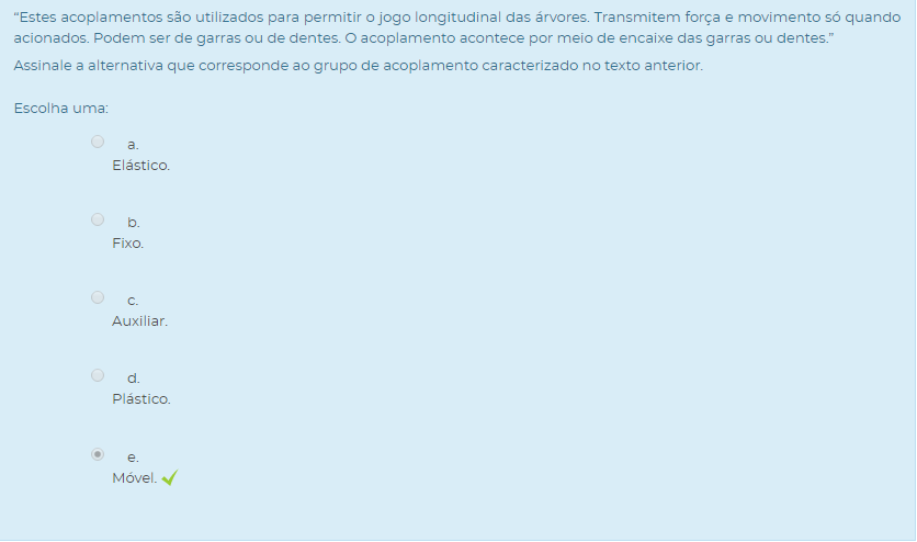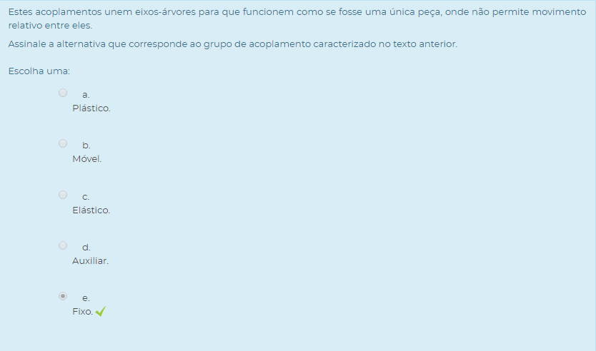 1) Um dos elementos de ligação são os acoplamentos. Pode-se definir acoplamento como um elemento mecânico utilizado para transmitir movimento de rotação entre duas árvores ou eixos-árvores (NORTON, 2013).