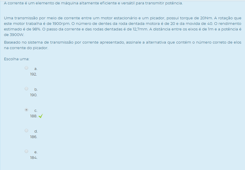 Uma transmissão por meio de corrente entre um motor estacionário e um picador, possui torque de 20Nm. A rotação que este motor trabalha é de 1900rpm. O número de dentes da roda dentada motora é de 20 e da movida de 40. O rendimento estimado é de 98%. O passo da corrente e das rodas dentadas é de 12,7mm. A distância entre os eixos é de 1m.