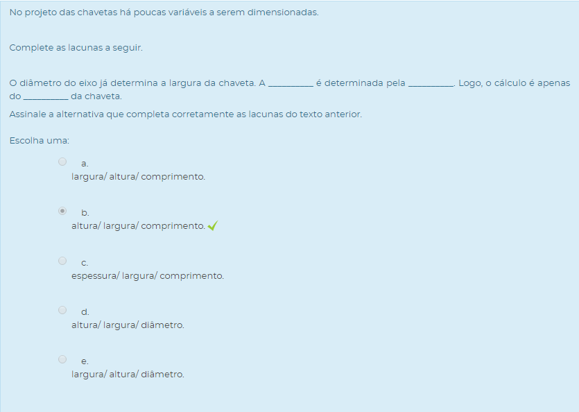 O diâmetro do eixo já determina a largura da chaveta. A __________ é determinada pela __________. Logo, o cálculo é apenas do __________ da chaveta.