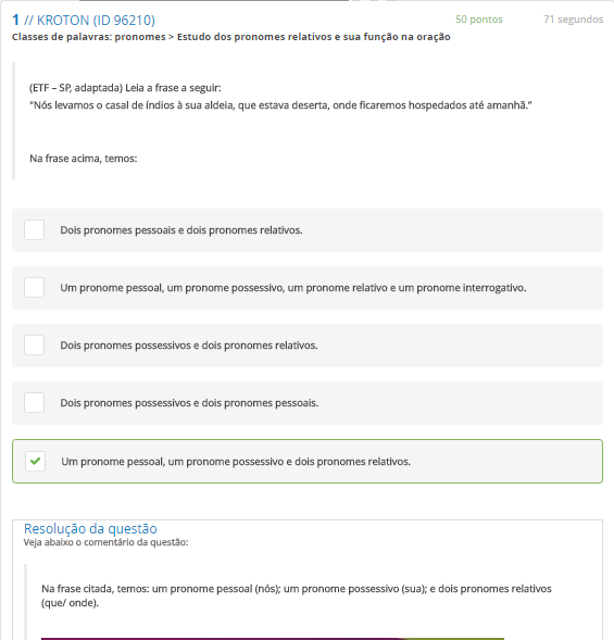 1 "Nós levamos o casal de índios à sua aldeia, que estava deserta, onde ficaremos hospedados até amanhã.” Na frase acima, temos: Escolha uma: a. Um pronome