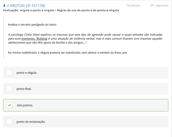 situação de violência verbal, mas é mais comum ficarem com traumas aqueles adolescentes que não têm apoio da família e dos amigos...”.No trecho sublinhado, a vírgula poderia ser substituída, sem alterar o sentido da frase, por