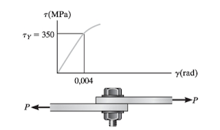 A partir do diagrama tensão-deformação de cisalhamento do material do elemento de ligação apresentado na figura, determine o módulo de elasticidade e o carregamento P necessário para provocar o escoamento do material. Sabendo que o parafuso tem diâmetro de 5 mm e coeficiente de Poisson é igual a 0,35.