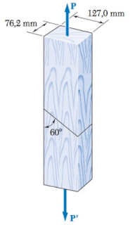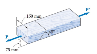 Em uma emenda de uma barra de madeira, conforme mostra a Figura a seguir, determine o carregamento P máximo para que a tensão de cisalhamento não exceda a 600KPa.