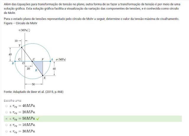 Para o estado plano de tensões representado pelo círculo de Mohr a seguir, determine o valor da tensão máxima de cisalhamento.