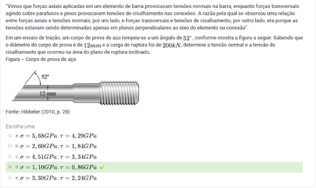 Em um ensaio de tração, um corpo de prova de aço rompeu-se a um ângulo de 52º, conforme mostra a figura a seguir. Sabendo que o diâmetro do corpo de prova é de 12mm e a carga de ruptura foi de 200Kn, determine a tensão normal e a tensão de cisalhamento que ocorreu na área do plano de ruptura inclinado.