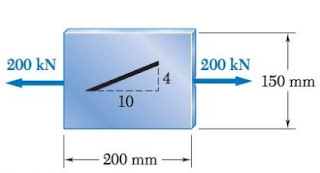 Em uma placa com dimensões apresentadas na figura a seguir e espesssura de 5 mm, foi desenhado uma linha com inclinação 4:10. Sabendo que E=100GPa e v=0,30, determine a inclinação da linha após ocorrer a deformação devido ao carregamento apresentado na figura.
