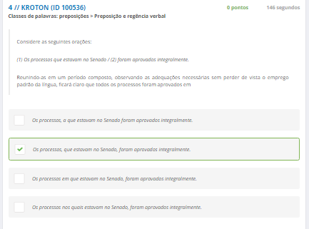 4 Considere as seguintes orações: Os processos que estavam no Senado / foram aprovados integralmente Reunindo-as em um período composto, observando as adequações necessárias sem perder de vista o emprego padrão da língua, ficará claro que todos os processos foram aprovados em Escolha uma: