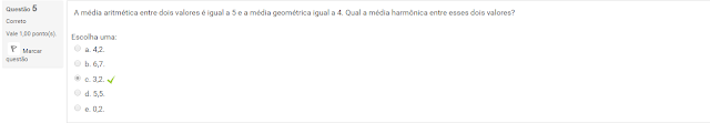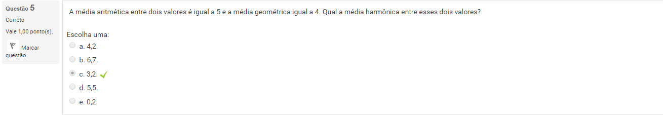5 A média aritmética entre dois valores é igual a 5 e a média geométrica igual a 4. Qual a média harmônica entre esses dois valores?