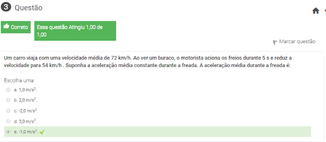 3 Um carro viaja com uma velocidade média de 72 km/h. Ao ver um buraco, o motorista aciona os freios durante 5 s e reduz a velocidade para 54 km/h . Suponha a aceleração média constante durante a freada. A aceleração média durante a freada é: