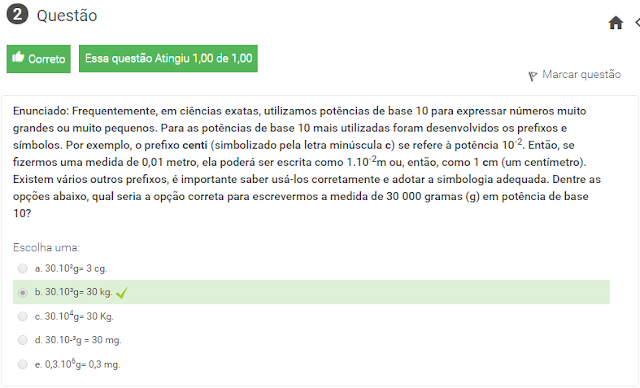 2 Enunciado: Frequentemente, em ciências exatas, utilizamos potências de base 10 para expressar números muito grandes ou muito pequenos. Para as potências de base 10 mais utilizadas foram desenvolvidos os prefixos e símbolos. Por exemplo, o prefixo centi (simbolizado pela letra minúscula c) se refere à potência 10-2. Então, se fizermos uma medida de 0,01 metro, ela poderá ser escrita como 1.10-2m ou, então, como 1 cm (um centímetro). Existem vários outros prefixos, é importante saber usá-los corretamente e adotar a simbologia adequada. Dentre as opções abaixo, qual seria a opção correta para escrevermos a medida de 30 000 gramas (g) em potência de base 10?