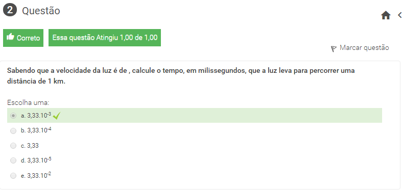2 Sabendo que a velocidade da luz é de , calcule o tempo, em milissegundos, que a luz leva para percorrer uma distância de 1 km.