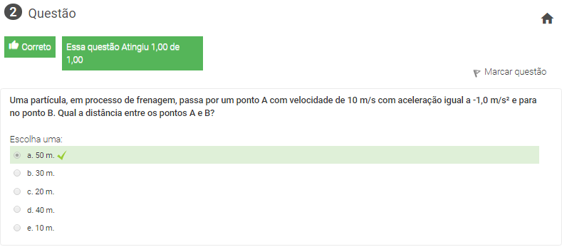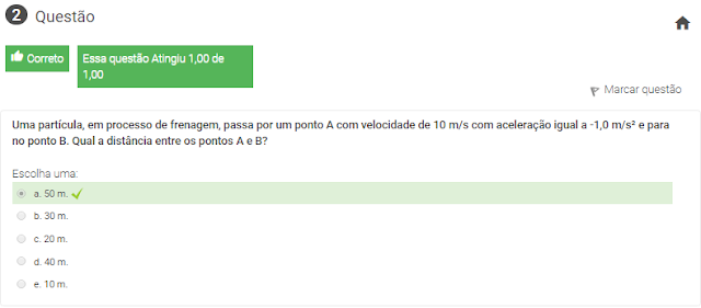 2 Uma partícula, em processo de frenagem, passa por um ponto A com velocidade de 10 m/s com aceleração igual a -1,0 m/s² e para no ponto B. Qual a distância entre os pontos A e B?