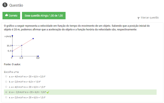 1 O gráfico a seguir representa a velocidade em função do tempo do movimento de um objeto. Sabendo que a posição inicial do objeto é 20 m, podemos afirmar que a aceleração do objeto e a função horária da velocidade são, respectivamente: