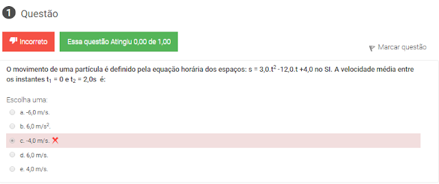 1 O movimento de uma partícula é definido pela equação horária dos espaços: s = 3,0.t2 -12,0.t +4,0 no SI. A velocidade média entre os instantes t1 = 0 e t2 = 2,0s é: