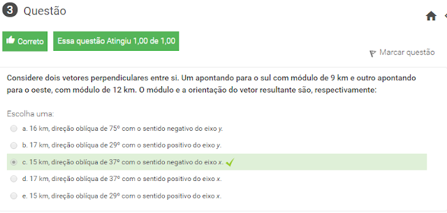 3 Considere dois vetores perpendiculares entre si. Um apontando para o sul com módulo de 9 km e outro apontando para o oeste, com módulo de 12 km. O módulo e a orientação do vetor resultante são, respectivamente:
