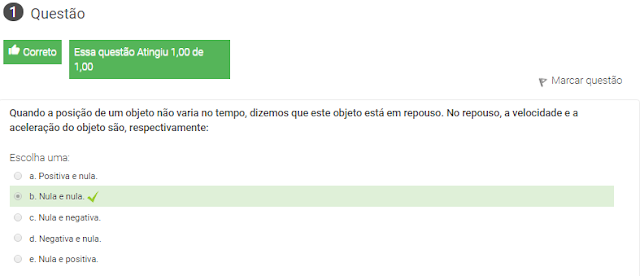 1 Quando a posição de um objeto não varia no tempo, dizemos que este objeto está em repouso. No repouso, a velocidade e a aceleração do objeto são, respectivamente: