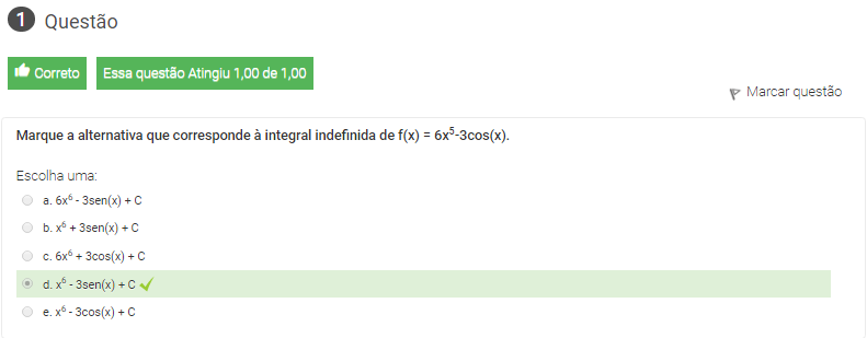 1 Marque a alternativa que corresponde à integral indefinida de f(x) = 6x5-3cos(x).