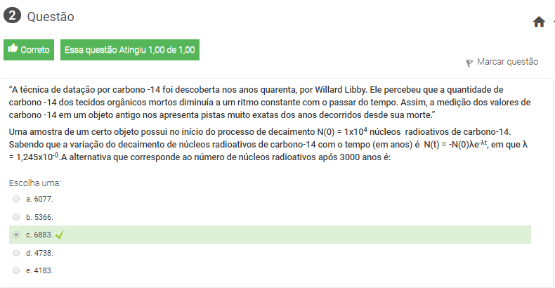 Uma amostra de um certo objeto possui no início do processo de decaimento N(0) = 1x104 núcleos radioativos de carbono-14. Sabendo que a variação do decaimento de núcleos radioativos de carbono-14 com o tempo (em anos) é N(t) = -N(0)λe-λt, em que λ = 1,245x10-0.A alternativa que corresponde ao número de núcleos radioativos após 3000 anos é: