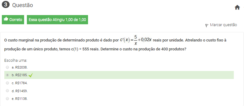 4 O custo marginal na produção de determinado equipamento é dado por c'(x) = 4/x reais por unidade. Atrelando o custo fixo à produção de um único equipamento, temos c(1)= 450 reais. Determine o custo de 1000 unidades.