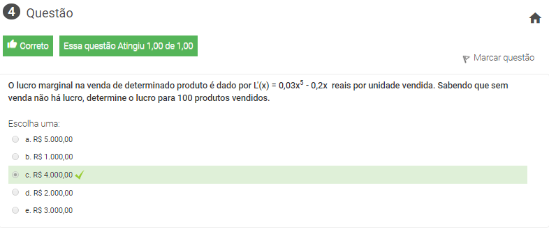 4 O lucro marginal na venda de determinado produto é dado por L'(x) = 0,03x5 - 0,2x reais por unidade vendida. Sabendo que sem venda não há lucro, determine o lucro para 100 produtos vendidos.