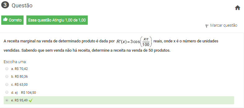 reais por unidade. Sabendo que sem venda não há receita (R(0) = 0) determine a receita na venda de 100 produtos?