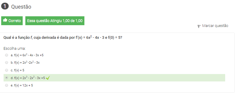 1 Qual é a função f, cuja derivada é dada por f'(x) = 6x2 - 4x - 3 e f(0) = 5?