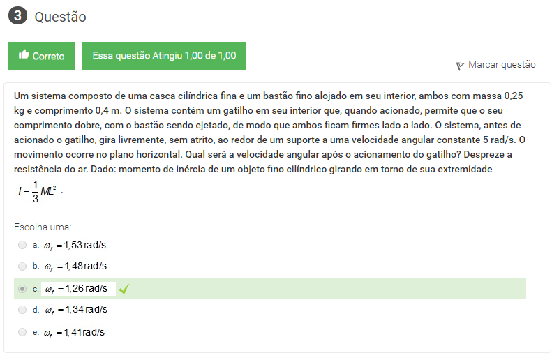 3 Um sistema composto de uma casca cilíndrica fina e um bastão fino alojado em seu interior, ambos com massa 0,25 kg e comprimento 0,4 m. O sistema contém um gatilho em seu interior que, quando acionado, permite que o seu comprimento dobre, com o bastão sendo ejetado, de modo que ambos ficam firmes lado a lado. O sistema, antes de acionado o gatilho, gira livremente, sem atrito, ao redor de um suporte a uma velocidade angular constante 5 rad/s. O movimento ocorre no plano horizontal. Qual será a velocidade angular após o acionamento do gatilho? Despreze a resistência do ar. Dado: momento de inércia de um objeto fino cilíndrico girando em torno de sua extremidade
