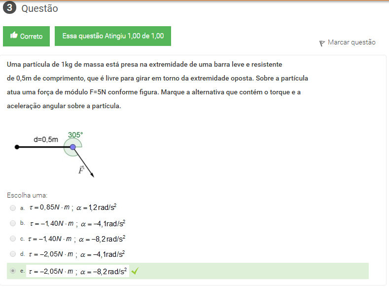 2 Em dado instante, uma partícula realiza um movimento circular de raio 4m com aceleração linear de 2m/s^2, sob a ação de um torque de 5N*m. Qual é a massa da partícula?