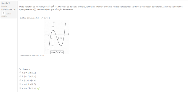 4 Dado o gráfico da função f(x) = x3 - 3x2 + 1. Por meio da derivada primeira, verifique o intervalo em que a função é crescente e verifique a veracidade pelo gráfico. Assinale a alternativa que apresenta o(s) intervalo(s) em que a função é crescente.