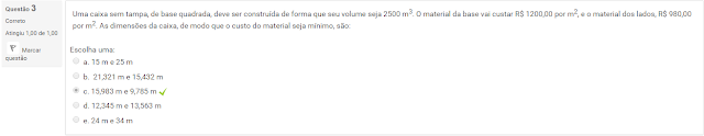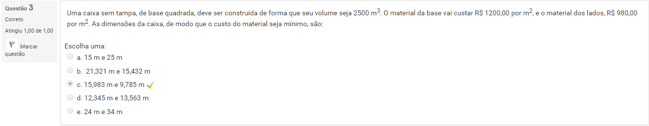 3 Uma caixa sem tampa, de base quadrada, deve ser construída de forma que seu volume seja 2500 m3. O material da base vai custar R$ 1200,00 por m2, e o material dos lados, R$ 980,00 por m2. As dimensões da caixa, de modo que o custo do material seja mínimo, são:
