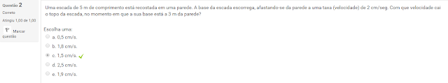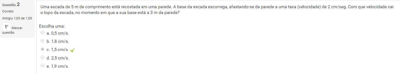 2 Uma escada de 5 m de comprimento está recostada em uma parede. A base da escada escorrega, afastando-se da parede a uma taxa (velocidade) de 2 cm/seg. Com que velocidade cai o topo da escada, no momento em que a sua base está a 3 m da parede?