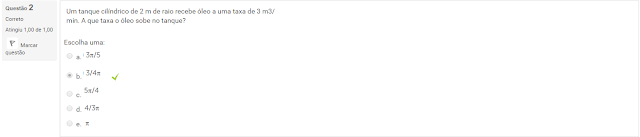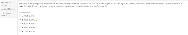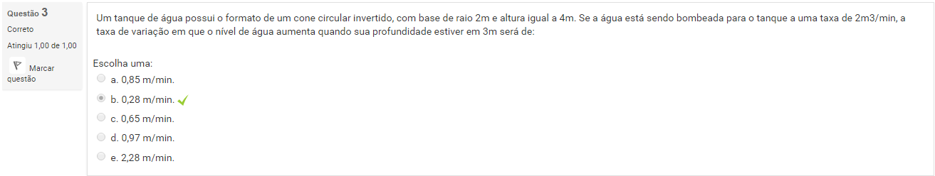 3 Um tanque de água possui o formato de um cone circular invertido, com base de raio 2m e altura igual a 4m. Se a água está sendo bombeada para o tanque a uma taxa de 2m3/min, a taxa de variação em que o nível de água aumenta quando sua profundidade estiver em 3m será de:
